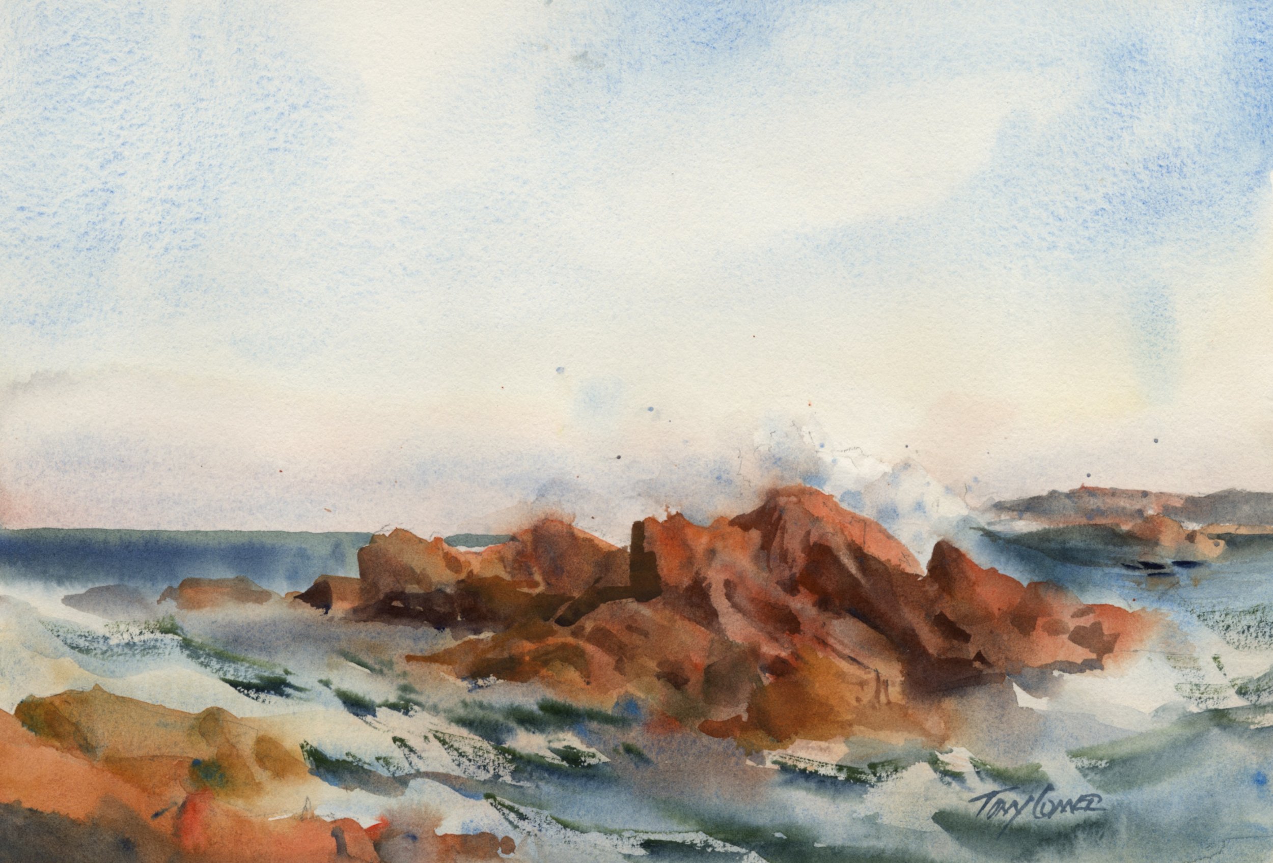 All paintings are expressions of some idea formed in the artist’s mind. Even the most realistic scene is actually abstracted and - to a very large degree - a re-constructed version of the subject. It is the same with this scene. The main group of rocks is changed in shape and size, and placed in a compelling location on the page. Every other element is added for balance but kept simple to support the idea and theme.